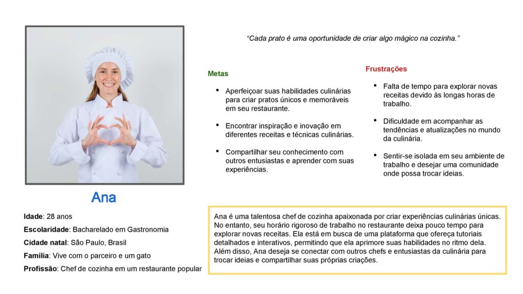 Ela está em busca de uma plataforma que ofereça tutoriais detalhados e interativos, permitindo que ela aprimore suas habilidades no ritmo dela. Além disso, Ana deseja se conectar com outros chefs e entusiastas da culinária para trocar ideias e compartilhar suas próprias criações.