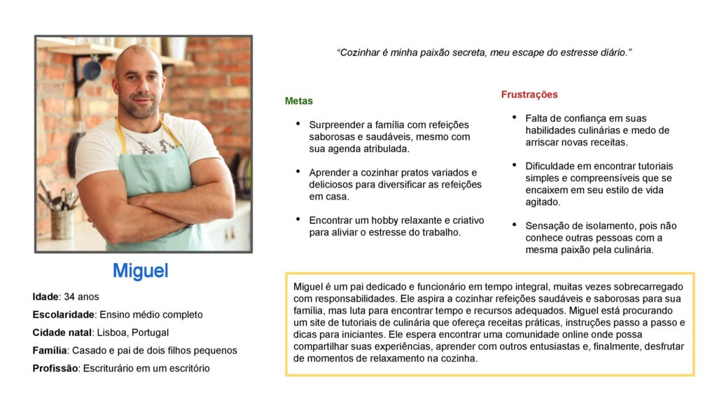 Miguel é um pai dedicado e funcionário em tempo integral, muitas vezes sobrecarregado com responsabilidades. Ele aspira a cozinhar refeições saudáveis e saborosas para sua família, mas luta para encontrar tempo e recursos adequados.