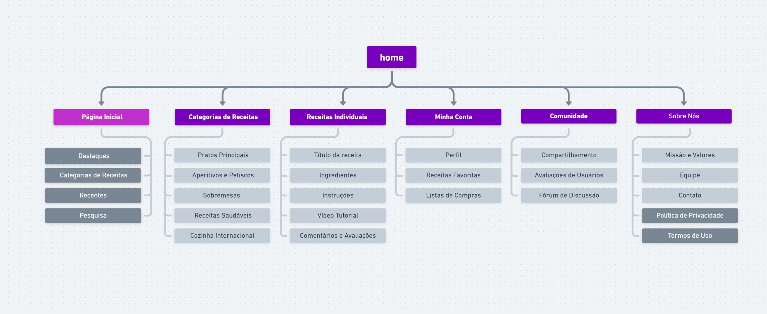 Este sitemap é uma estrutura hierárquica que detalha as principais seções e páginas do aplicativo/site “Culinarium”. Ele serve como um guia para o design e desenvolvimento, garantindo que todas as funcionalidades essenciais sejam contempladas e que a navegação seja intuitiva e fácil para os usuários.