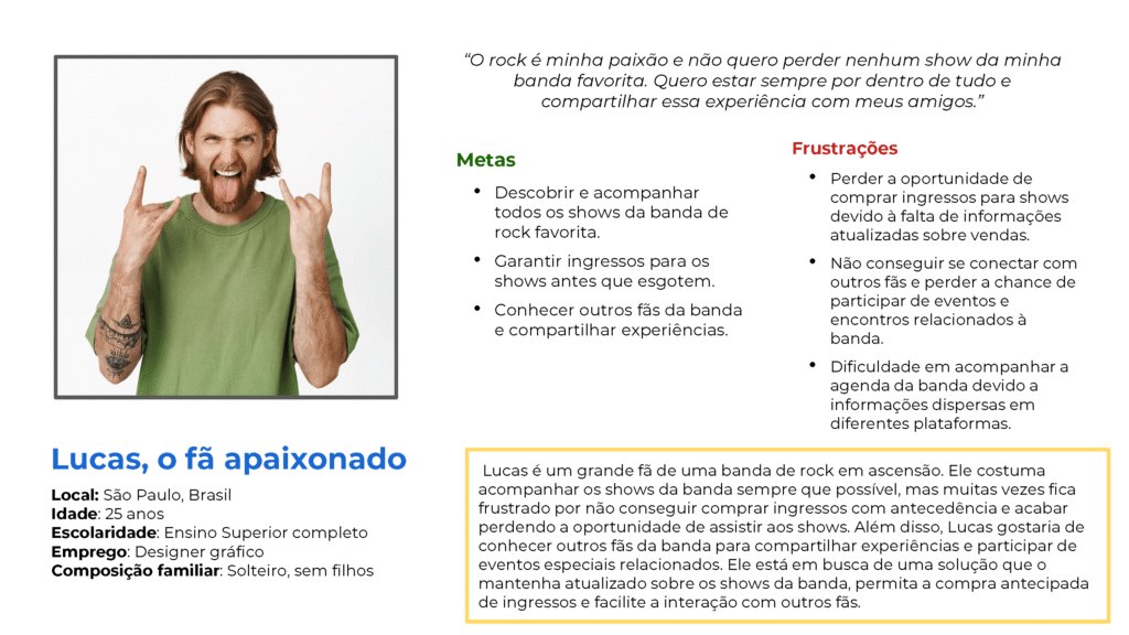 Além disso, Lucas gostaria de conhecer outros fãs da banda para compartilhar experiências e participar de eventos especiais relacionados. Ele está em busca de uma solução que o mantenha atualizado sobre os shows da banda, permita a compra antecipada de ingressos e facilite a interação com outros fãs.