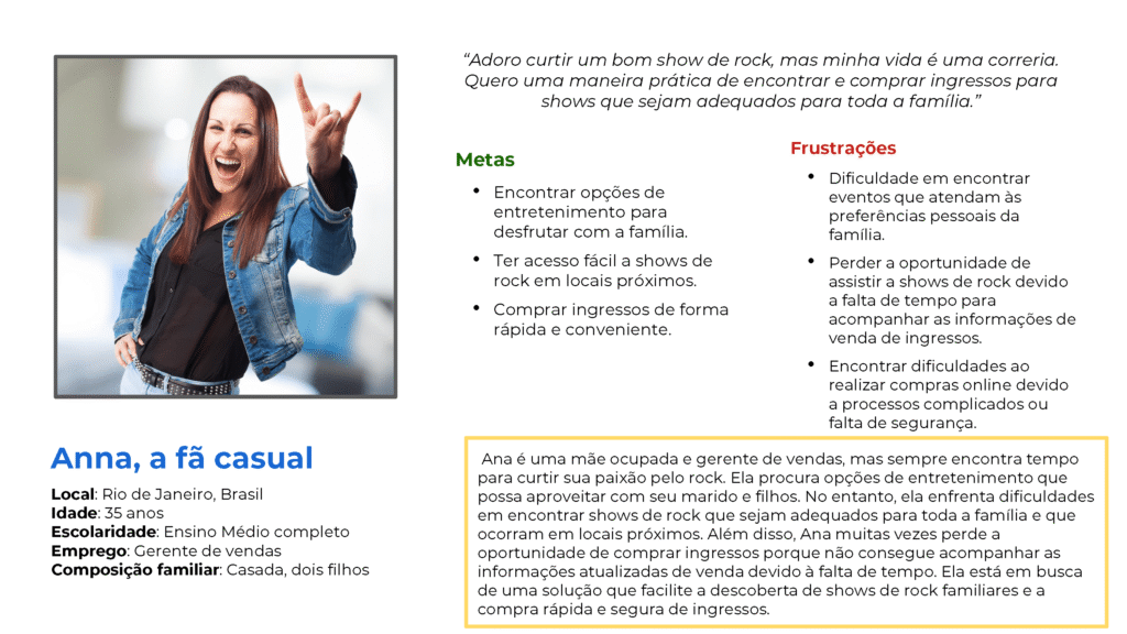 No entanto, ela enfrenta dificuldades em encontrar shows de rock que sejam adequados para toda a família e que ocorram em locais próximos. Além disso, Ana muitas vezes perde a oportunidade de comprar ingressos porque não consegue acompanhar as informações atualizadas de venda devido à falta de tempo.